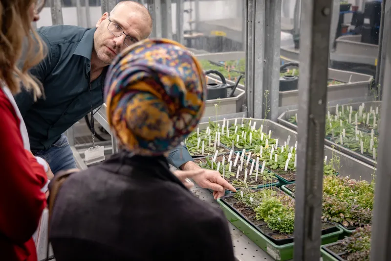 The tour was fascinating. Guided by the Institute’s Professor Julie Gray and Professor Jurriaan Ton we peered at plants in controlled laboratory environments, from shuttered mirrored micro labs to glass houses and plastic tents, as scientists explained their work. We heard about analysing the exchange between plants and fungi in soil, photosynthesis and water loss in genetically modified wheat, rice, and maize, and identifying every gene in lettuce to establish disease resistance.